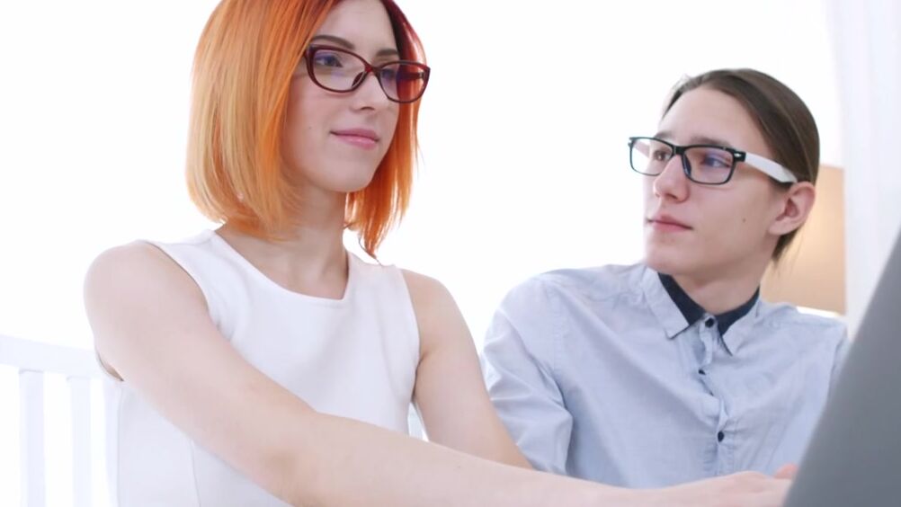 Программист, помогающий худой рыжей студентке в очках, не может совладать с сильным желанием. Два ботаника от робких прелюдий переходят к анальному сексу, и заканчивают спермой во рту.