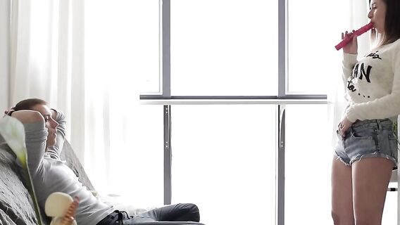 Ничто не остановит девушку, жаждущую члена, даже работа парня. Она будет соблазнять его, облизывая красный дилдо, и он не устоит. Без табу и лишних слов, пара занялась красивым сексом.